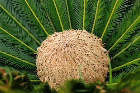 Female cone and bright glossy green foliage of cycas revoluta cycadaceae sago palm