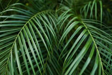 Brunches of palm tree. Green leaves background. Wallpaper with thin palm leaves