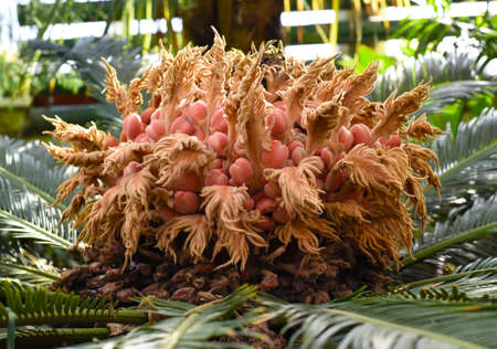 Cycad male and female flowers. Gymnospermae Cycadaceae dioecious shrub. The flowering season is summer, the male flowers are columnar and the female flowers are dome-shaped.