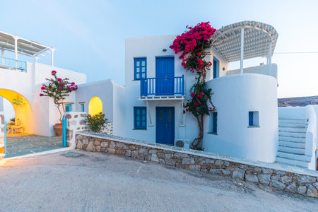 Folegandros Island, Greece - 23 September 2020: A narrow side street in Chora, old town. Characteristic Greek buildings at sunset.