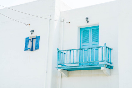 Traditional houses withe blue doors in the narrow streets of Mykonos, Greece.