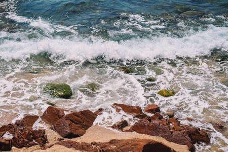 Waves breaking on the shore rocks with sea foam, Mallorca