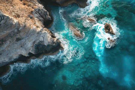 Aerial top down view of Cyprus ocean azure water surface, showcasing rocks amidst crashing waves below
