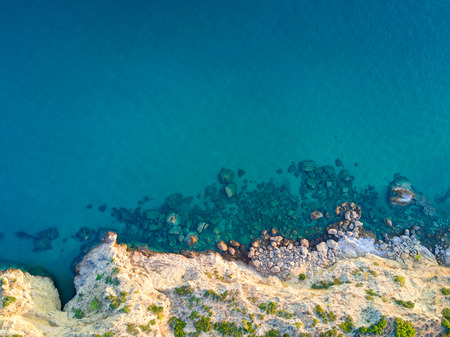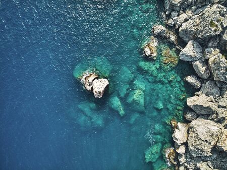 Mediterranean sea. Aerial view on the water and rocks during sunset. Vacation and adventure. Beach and blue water. Top view from drone at beach and azure sea.