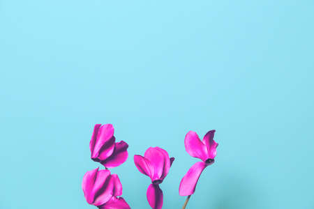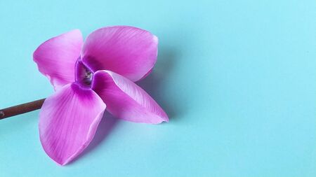 Pink cyclamen flower on a blue background. A tender plant is ripped off. Greeting card or congratulation on March 8 or mothers day