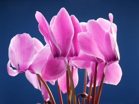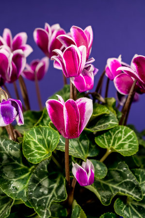 Closeup of cyclamen flowers shot over dark blue background