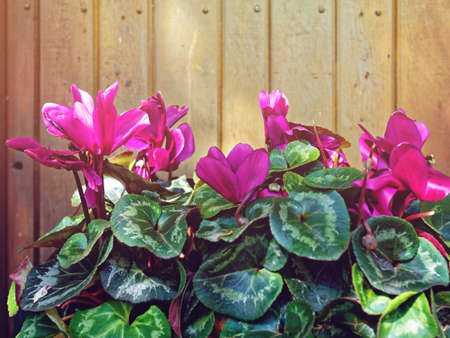 Beautiful cyclamen flowers, rustic background, free space for text
