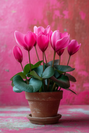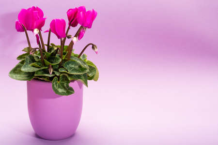 cyclamen flower in pot on minimalist vivid background, large copyspace area.