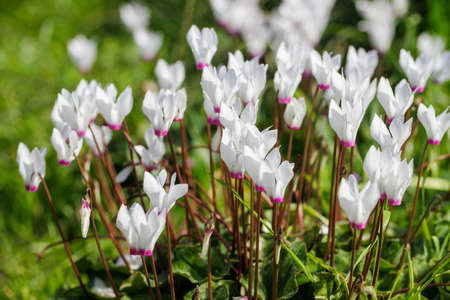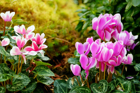 Pink white cyclamen flowers in garden bed
