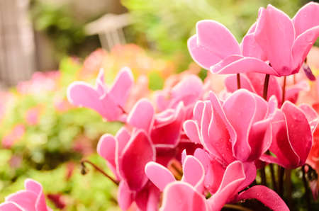 pink and red cyclamens in the garden for colorful blurry background
