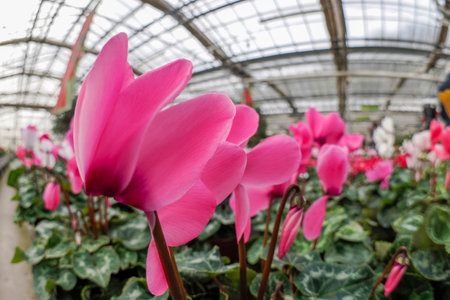 lot of colorful cyclamen in a green house