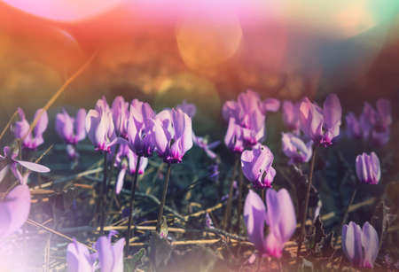Purple cyclamen flowers growing in the forest, beautiful nature background
