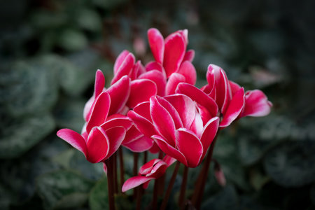 Close-up of vivid red Cyclamen flowers in the garden on a dark green background.