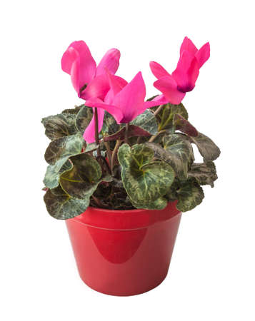 Pink cyclamen in a red pot isolated on white background