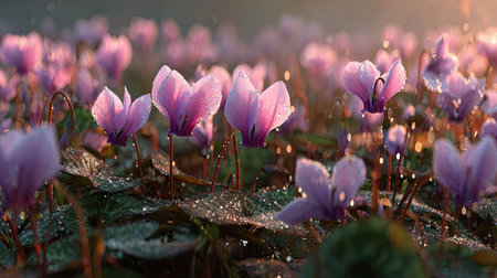 A panoramic wide view of Cyclamen field growing closely together in a dewy morning shining droplets on leaves warm soft daylight ultra realistic photography cinematic wide composition lifelike natural scene