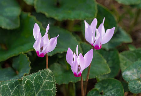 Close up of flowers cyclamen Cyclamen Persian persicum blooming in the forest, Migdal HaEmek, Northern Israel