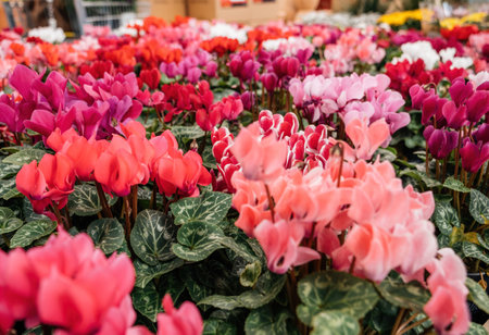 A vibrant display of Cyclamen plants in various shades of pink, red, and purple at a florist store, creating a colorful and inviting atmosphere for customers