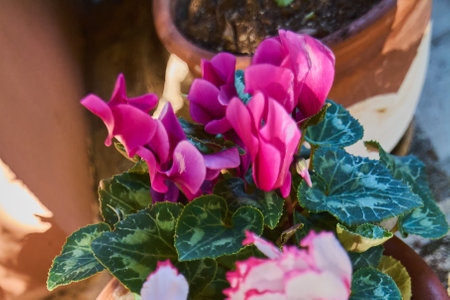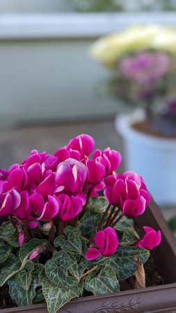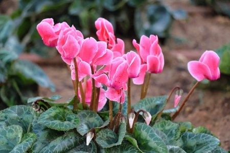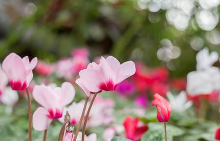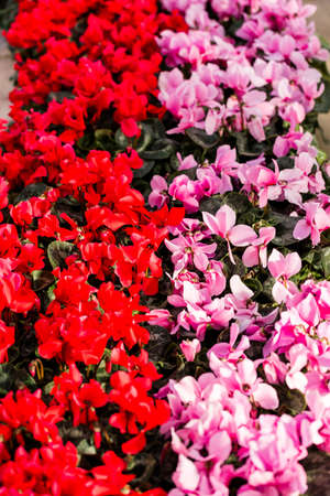 Closeup of blossoming cyclamen plants cultivated in hothouse
