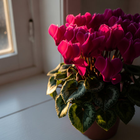 A bouquet of pink cyclamen flowers on the windowsill.