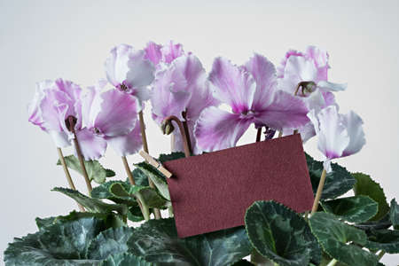 Pink cyclamen bloom and green leaf. Blooming floral pot. Red color greeting delivery card middle of flower. White background