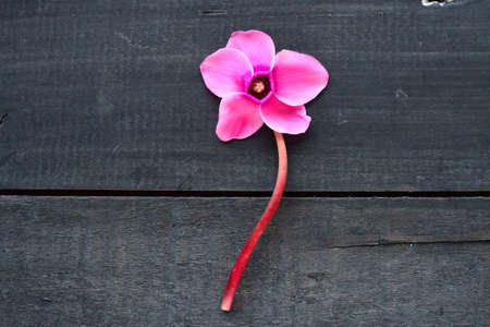 Cyclamen flower side view on black shabby wooden background. One flower with five petals, Stem without leaves. Copy space. Beautiful floral card with cyclamen. Rustic pastoral style, french provence
