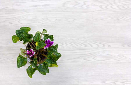 Top-down view of a pot of purple and white cyclamen on a white wooden background