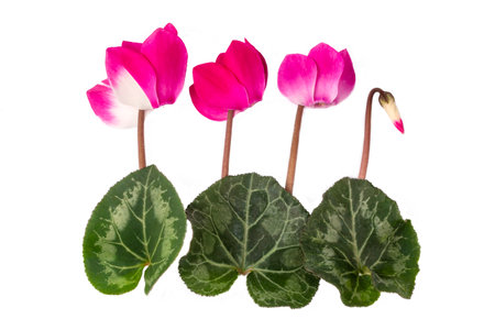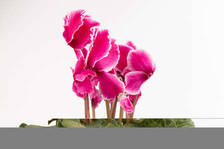Pink cyclamen flowers and green leaves on the white background