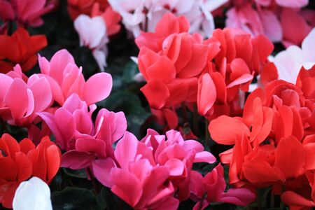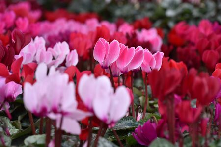 Pink, red, and purple cyclamen flowers close-up. High quality photo