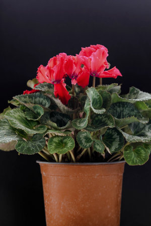 Potted red Cyclamen, Persian violet, houseplant with free space for text. Selective focus with blurred background and foreground.
