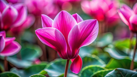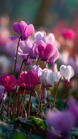 A wide shot of Cyclamen swaying gently in the wind, realistic photography style, bright and vivid colors, natural lighting.