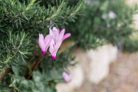 Wild rosemary bush with three beautiful pink cyclamen flowers outdoor with blurred background