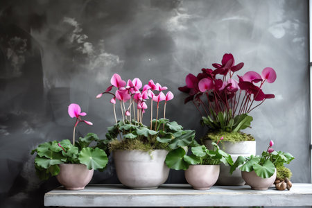 A stunning arrangement of pink cyclamen flowers in a minimalist pot, showcasing their graceful petals and lush green leaves in soft natural light for an elegant ambiance.