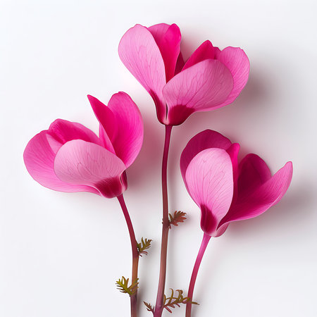 Close-up of strikingly beautiful magenta and white cyclamen flowers blooming. Studio shot against a solid, dark green backdrop. Perfect for gardening and interior design