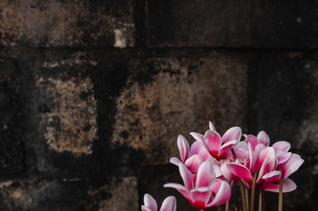 purple blooming cyclamen near old black wall near shop as a decoration of shop