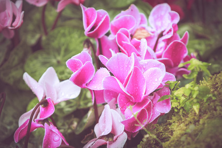abstract dreamy and blurred image of cyclamen flowers blooming in the forest. vintage filtered and toned