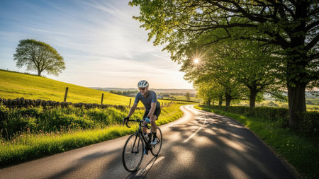 A cyclist rides a bicycle along a winding road, the image is bathed in bright sunlight. The road is flanked by lush green trees and fields. The scene's dynamic composition suggests motion and outdoor activity. Suitable for use in various commercial and editorial contexts related to health, travel, and lifestyle.
