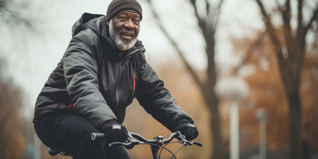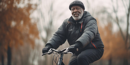 Leisurely bike ride by an older man in a park, dressed in black with a beanie, amidst green scenery. AI generative.