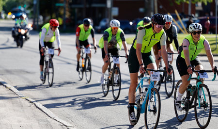 A captivating scene from a vibrant cycling event showcasing competitive athletes in motion under bright sunlight on an urban street.