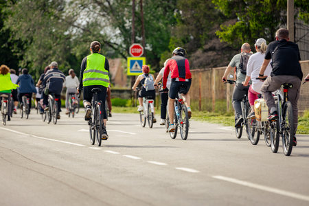 Group of young people cycling, ride bicycles in city, driving in crowd they try to draw attention to the danger for cyclists in traffic, urban environment.