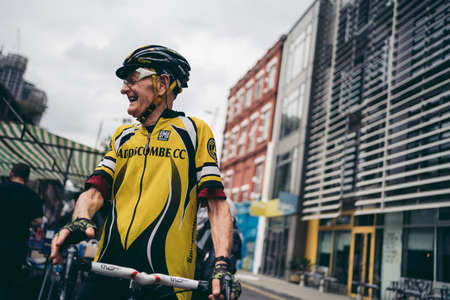 Brick Lane, East London / UK - 2020.08.16: Old cyclist gentleman on the bike at Vintage Market