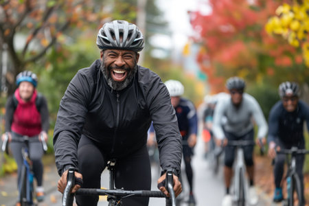 Exuberant man on a bicycle leads a group of cyclists on a scenic road surrounded by fall foliage, sharing laughter and fitness