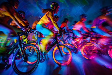 A group of cyclists rides energetically in a nighttime event, showcasing their bikes with brilliant glowing lights, creating a vibrant and dynamic atmosphere.