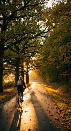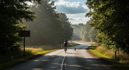 A cyclist rides a bicycle along a winding road, the image is bathed in bright sunlight. The road is flanked by lush green trees and fields. The scene's dynamic composition suggests motion and outdoor activity. Suitable for use in various commercial and editorial contexts related to health, travel, and lifestyle.