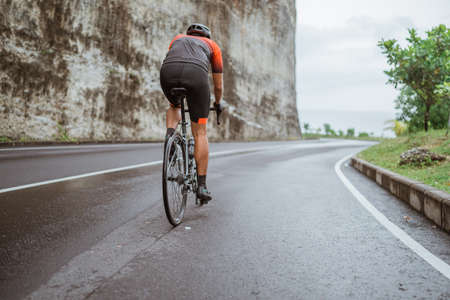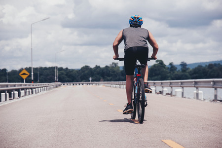 male cyclist riding his bike in country side shoot from the back