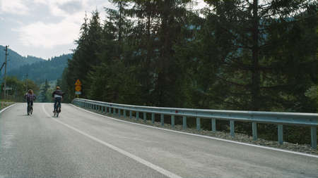 Riders cycling mountain highway in summer nature forest. Friends ride bikes on road back view. Unrecognizable couple enjoy summer outdoor activity in green environment landscape. Leisure concept.