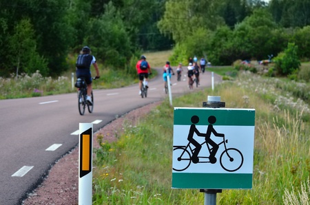 Bike road in park with a bicycle sign marking. Healthy lifestyle