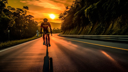 Cyclist riding bicycle on the road at sunset in the morning