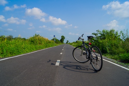 riding a bicycle in the countryside, with blue sky and sunset