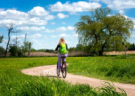 Riding along a perfect road Rear view of beautiful young woman riding bicycle : Generative AI