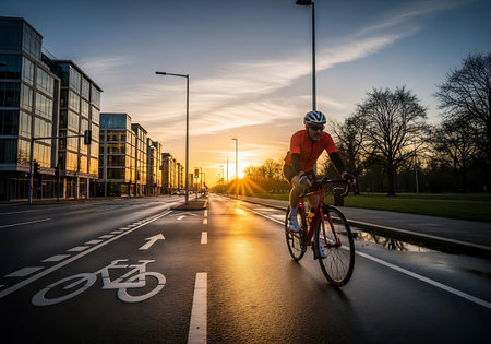Cyclist riding bicycle on the road in the city at sunset